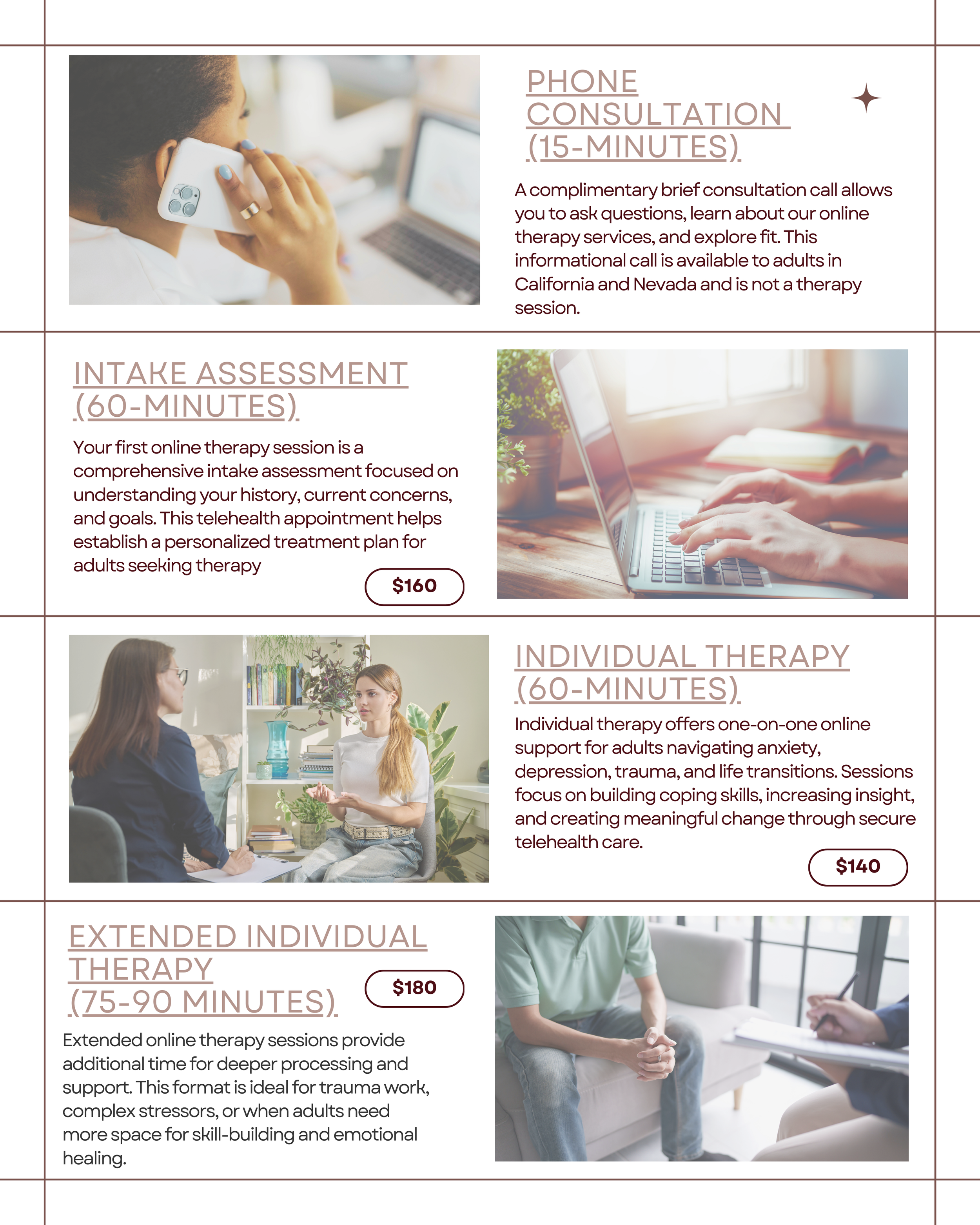 As a fully virtual telehealth practice, we offer convenient, secure therapy sessions accessible from the comfort of home. Services are available to adults throughout California and Nevada, with evening and limited weekend appointments to support busy schedules.